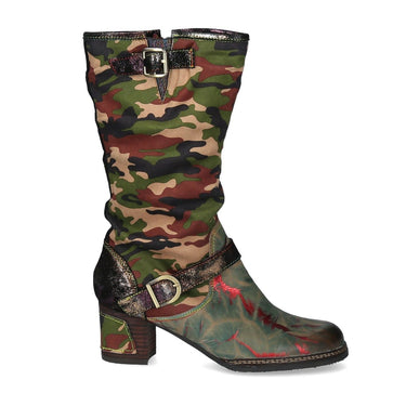 Stivali in pelle e tessuto con motivo mimetico.