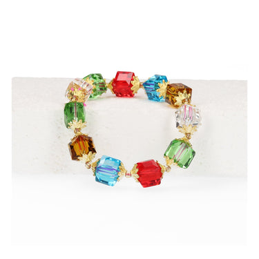 Daj się uwieść radosnemu blaskowi naszej wielokolorowej bransoletki Sparkling Cube Bracelet. Ta urzekająca biżuteria składa się z precyzyjnie wyciętych sześciennych koralików, z których każdy ma jasny, świetlisty kolor, który łapie światło pod każdym kątem. Perły są oddzielone eleganckimi złotymi nasadkami z delikatnym wykończeniem, dodając odrobinę luksusu i fantazji.